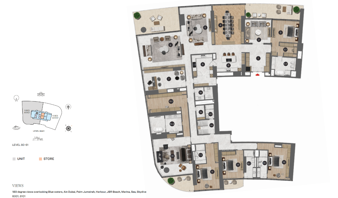 Prime waterfront location in Dubai Harbour, with panoramic views of the sea, Palm Jumeirah, and city skyline.