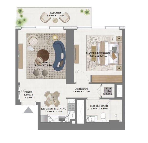 One-bedroom apartments range from approximately 754 to 776 square feet and are designed for efficient, comfortable living with well-defined sleeping, dining, and relaxation zones. Prices for these units start from around AED 1.81 million.