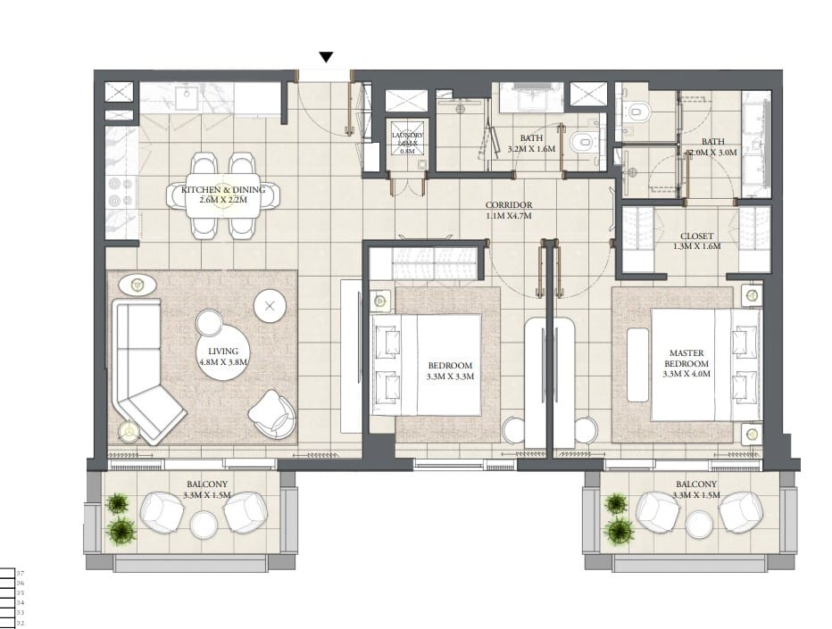 - 2-Bedroom Apartments from approximately 1,005 to 1,065 sq ft