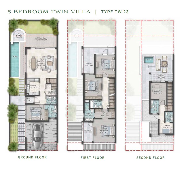 Park Greens twin villas follow a modern architectural approach with clean lines and efficient interior planning. The three-level configuration provides privacy between communal and private spaces, while gardens and terraces extend usable living areas outdoors. This suits buyers seeking villas with garden space in Dubai and homes with outdoor areas.