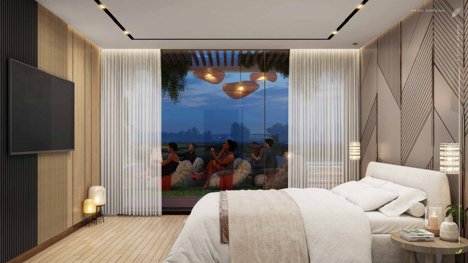 The signature TW-23 Park Greens twin villa is distributed across three floors and offers approximately 3,542 sq ft of built-up area. The design separates living, sleeping, and leisure areas, which is particularly suited to larger or multi-generational families.
