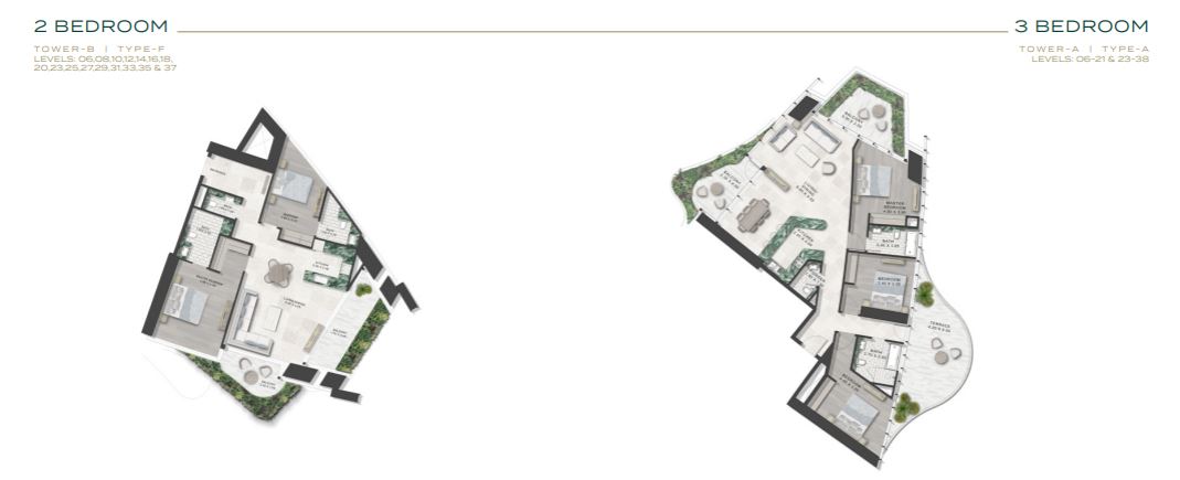 - 2 & 3 Bedroom Apartments: These “Luxury” and “Super Luxury” levels include private splash pools on the balconies.