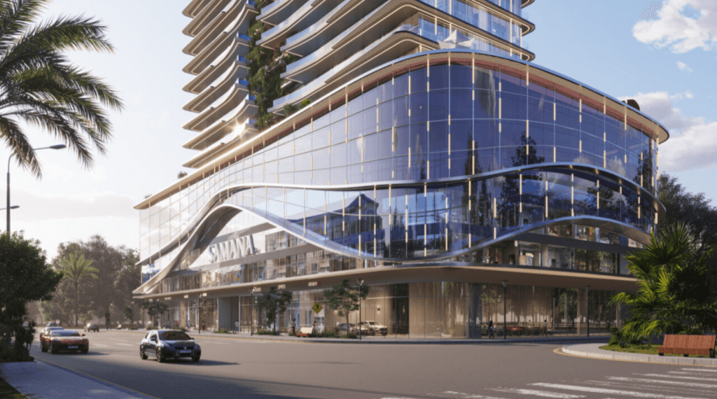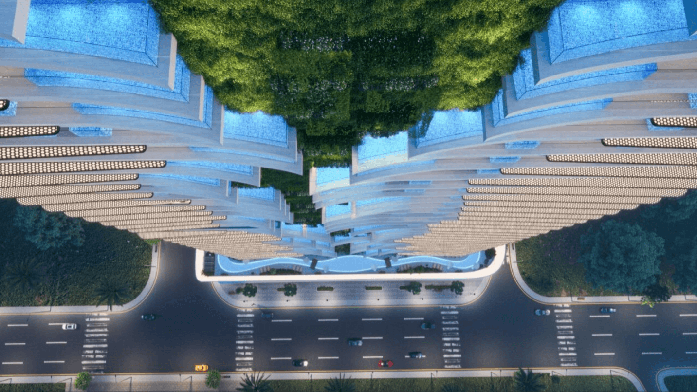 The design of Barari Lagoons moves away from traditional glass boxes, opting instead for a facade that integrates flowing lines and vertical greenery.