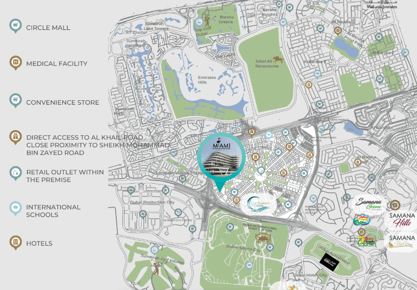 Located in District 14, SAMANA Miami provides residents with quick access to Al Khail Road and Hessa Street, ensuring seamless city-wide connectivity.