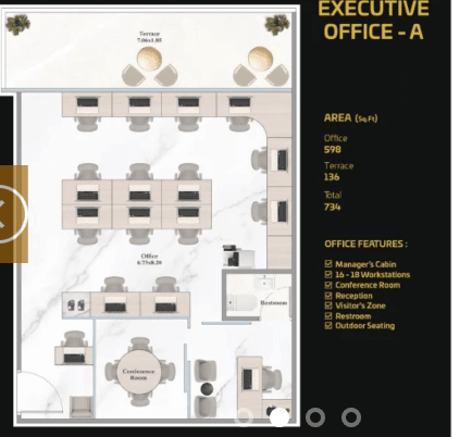 - Premium Offices (1,200 – 1,500 sq. ft.): Massive spaces for 38-40 workstations, complete with high-end features and outdoor seating.
