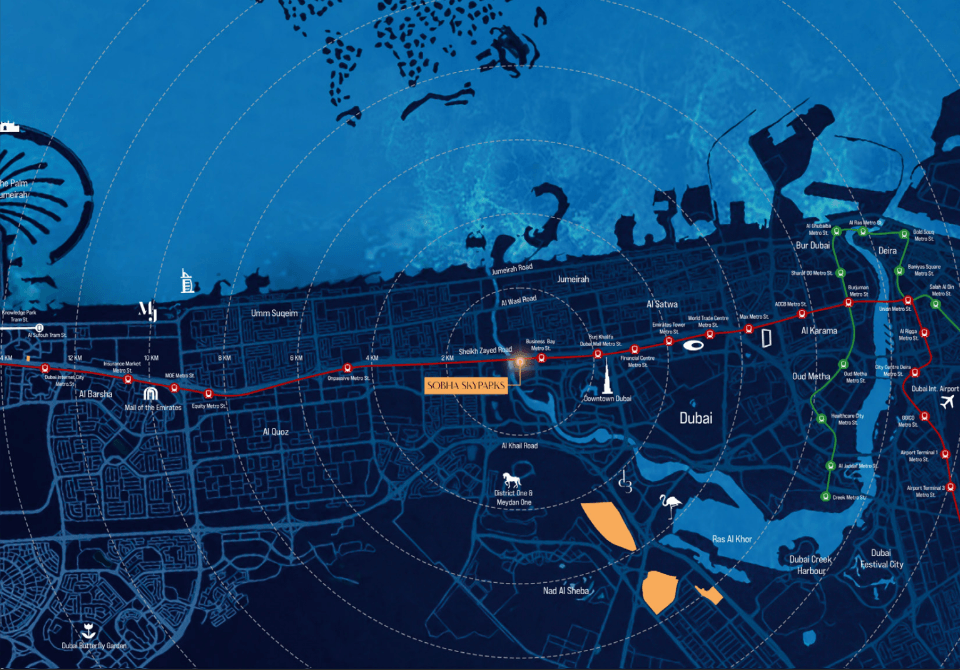 Sobha SkyParks enjoys one of the most prestigious addresses in Dubai. Positioned along Sheikh Zayed Road, residents benefit from effortless access to:
